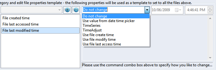 After select a file in the file list, please select the "File date time" category in the list box on the left, then all the file time properties are listed in the next listbox, and related controls are enabled. Select the file date time item in the list, you will see the value displayed on the right, and then, you can use the controls to modify the date time value. You can select multiple date time properties from the list, and modify them together.