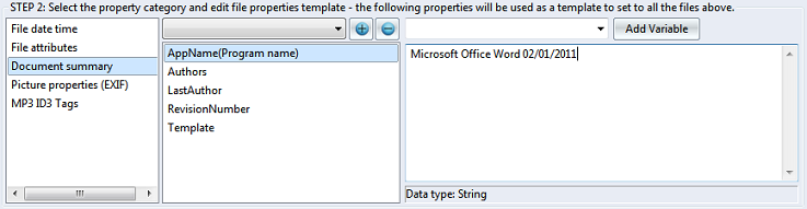 From this variable combobox, you can select to add variable to the property edit box, then File Property Edit will use that variable to generate dynamic value and set it to the file.