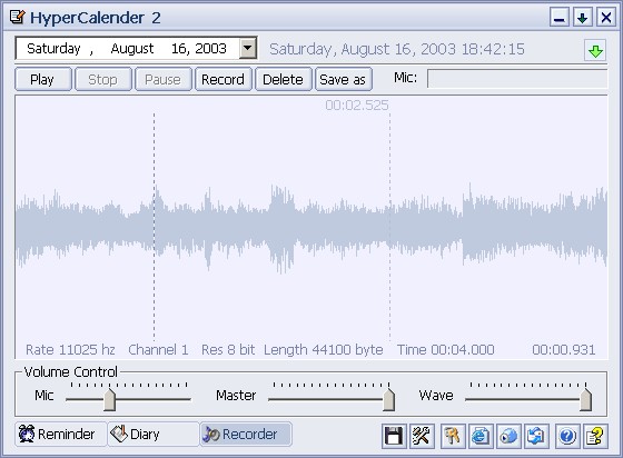 Write your diary in richtext, insert pictures (jpg,gif,ico,bmp,wmf), attach any files, even record your voice* in the diary. All the diaries are encrypted by IDEA arithmetic, and encoded with your password, it's to keep your personal information here.